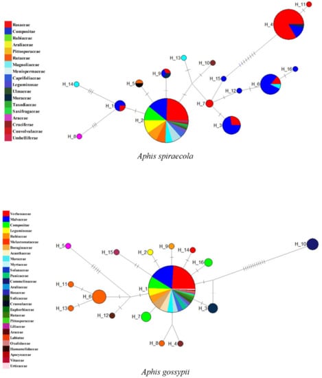 Haplotype networks of Aphis spiraecola and A. gossypii based on COI sequences grouped by host plant families. The circles represent different haplotypes, and the short line segments indicate mutated positions between haplotypes. Different colors and sizes of the circles represent host plant families and relative numbers of sequences (A. spiraecola: H_1: 4,H_2: 74, H_3: 11, H_4: 30, H_5: 2, H_6: 14, H_7: 2, H_8: 1, H_9: 3, H_10: 1, H_11: 1, H_12: 1, H_13: 1, H_14: 1, H_15: 1, H_16: 1; A. gossypii: Hap_1: 146, Hap_2: 1, Hap_3: 3, Hap_4: 1, Hap_5: 1, Hap_6: 6, Hap_7: 3, Hap_8: 1, Hap_9: 1, Hap_10: 4, Hap_11: 1, Hap_12: 1, Hap_13: 1, Hap_14: 1, Hap_15: 1, Hap_16: 2.