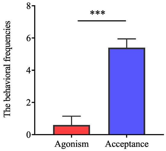 • Agonism reduced mating frequency, while acceptance represents more possibility of mating when interspecific reproductives encounter each other. Our results indicated that the frequencies of acceptance were significantly higher than those of aggression between interspecific partners when they encountered each other (Figure 1; t = −8.35, df = 8, p < 0.0001).