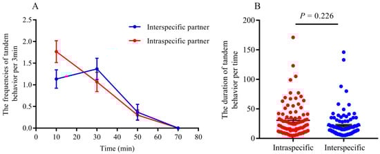 Figure 2. (A): The frequencies of tandem behavior observed in intraspecific and interspecific partners. (B): The duration of tandem behavior per time (unit: min). There were no significant differences in frequencies of tandem behavior between intraspecific and interspecific partner at each observing point (GLMM: F = 0.34, p = 0.56). Similarly, there were no significant differences in the duration of tandem between them (t = 2.31, p = 0.22).
