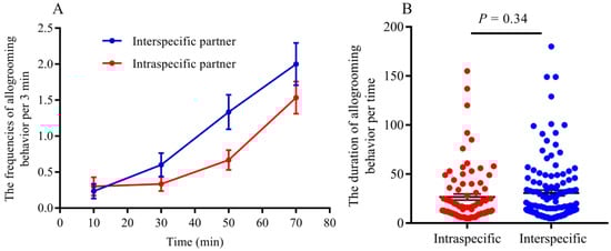 Figure 3. (A): The frequencies of allogrooming in intraspecific and interspecific partners. (B): The duration of allogrooming behavior per time (unit: min). The allogrooming frequencies in interspecific partners is significantly higher than those in intraspecific partners (GLMM: F = 6.39, p = 0.012), but there were no significant differences in the duration of allogrooming between them (t = −0.96, p = 0.34).