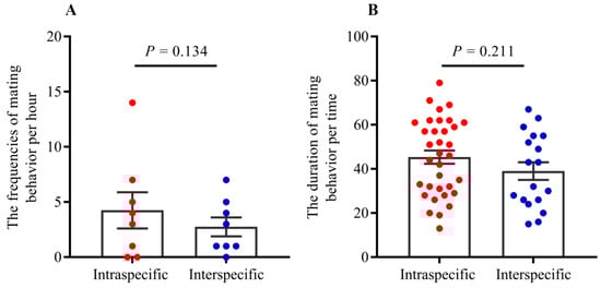 Figure 4. (A): The frequencies of mating in intraspecific and interspecific partners. (B): The duration of mating behavior per time (unit: min). There were no significant differences in mating frequencies per hour (GLMM: F = 2.53, p = 0.13) and durations (t = 1.27, p = 0.21) between intraspecific and interspecific partners.
