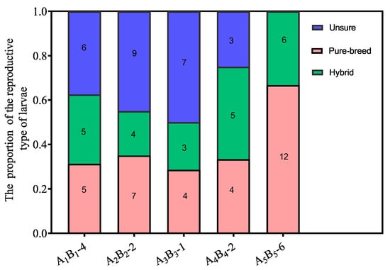 Figure 5. The proportion of larvae from the different mating types. The number in bar represent the number of larvae from this mating types in each colony.