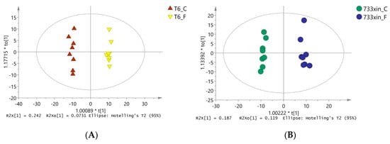 To eliminate noise information unrelated to classification (e.g., the control group and processing) and obtain more reliable metabolite information that results in significant differences between the two groups of samples, orthogonal partial least squares discriminate analysis (OPLS-DA) was used to filter the unrelated signals with model classification, i.e., orthogonal, to obtain the OPLS-DA model (Figure 2). We found significant differences (spectral separation) between the two groups on the OPLS-DA score map: R2Y = 0.993, Q2 = 0.903 between T6_F and T6_C; R2Y = 0.989, Q2 = 0.805 between 733xin_F and 733xin_C; R2Y = 0.996, Q2 = 0.967 between T6_C and 733xin_C; and R2Y = 0.998, Q2 = 0.929 between T6_F and 733xin_F. These four sets of data indicated that the OPLS-DA model has good explanatory and predictive abilities for metabolic phenotypic differences among groups. The 733xin strain has greater metabolic differences after NaF stress, whereas the T6 strain has higher fluoride tolerance, indicating that the metabolic differences after NaF stress are smaller than 733xin.