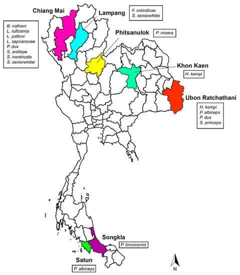 From 2015 to 2016, flesh fly collections were carried out in 7 provinces of Thailand, including Chiang Mai, Lampang, Phitsanulok, Khon Kaen, Ubon Ratchathani, Songkla, and Satun (Figure 1). Collections were performed by sweeping method using 300 g of 1-day tainted beef offal as the attractive bait. After collections, specimens were frozen at −20 °C for 1 h and adult males were identified based on the comparative morphology of male genitalia, as previously described []. Subsequently, all identified males were preserved in 70% ethanol and kept at −20 °C until further used for molecular analysis. Additionally, different isolines of 12 flesh flies and 2 house flies (Musca domestica Linnaeus) from the rearing laboratory of the Department of Parasitology, Faculty of Medicine, Chiang Mai University, were included in the study. Details of collection data for all fly specimens are shown in Table 1.