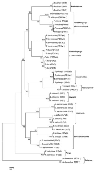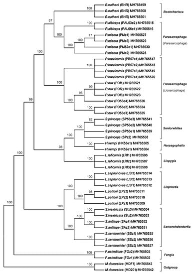 - PiwczyŃSki, M.; Szpila, K.; Grzywacz, A.; Pape, T. A large-scale molecular phylogeny of flesh flies (Diptera: Sarcophagidae). Syst. Entomol. 2014, 39, 783–799. [Google Scholar] [CrossRef]