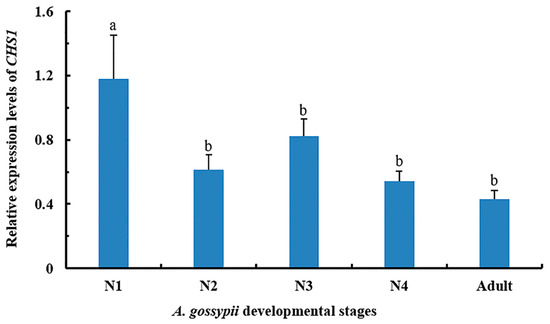 Relative expression pattern of CHS1 gene at different developmental stages of A. gossypii analyzed by qRT-PCR. The expression level is expressed as the mean (±SE) of the three biological replicates, and thirty insects were used per pooled RNA sample. Letters above the bars represent significant differences at p < 0.05 level (one-way ANOVA followed by Tukey’s HSD test). EF1α and β-actin are used as the internal control. N1: first instar; N2: second instar; N3: third instar; N4: fourth instar.