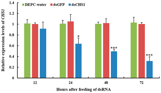 Quantitative real-time PCR (RT-qPCR) was used to scrutinize the silencing efficiency of dsCHS1 in aphids. We investigated the expression level of the CHS1 gene after continuous oral delivery of dsRNA to the third-instar nymph of A. gossypii for 12, 24, 48, and 72 h (Figure 2). RT-qPCR analysis indicated significantly (p < 0.05) reduced transcript level of CHS1 mRNA after the oral uptake of dsRNA-CHS1 for 24 h, as compared with the DEPC-water and dsGFP control treatments. After 48 and 72 h of ingestion, dsRNA-CHS1 caused very significant (p < 0.001) reduction in CHS1 mRNA abundance, indicating a substantial gene silencing (Figure 2). However, no significant differences were observed for CHS1 mRNA transcript level at 12 h post-feeding of dsRNA-CHS1, as compared with positive and negative control treatments.