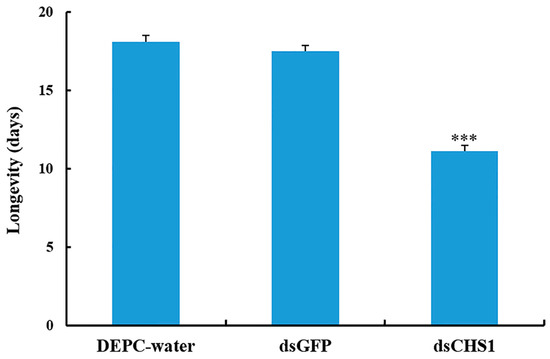 Impact of CHS1 gene silencing on adult longevity of A. gossypii, previously fed artificial diets containing DEPC-water, dsGFP, and dsCHS1 at their nymphal stage (third instar). The values are presented as the mean (±SE). Thirty individuals per experimental group (DEPC-water, dsGFP, and dsCHS1) were used, and each aphid was considered as a single replicate. Treatments were compared using one-way ANOVA (Tukey’s HSD test, p < 0.05). *** represents p < 0.001.