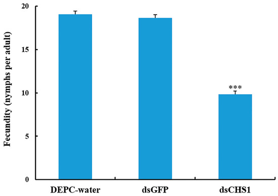 Effect of CHS1 gene silencing on fecundity of A. gossypii, previously fed artificial diets containing DEPC-water, dsGFP, and dsCHS1 at their nymphal stage (third instar). The values are presented as the mean (±SE). Thirty individuals per experimental group (DEPC-water, dsGFP, and dsCHS1) were used and each aphid was considered as a single replicate. Treatments were compared using one-way ANOVA (Tukey’s HSD test, p < 0.05). *** represents p < 0.001.
