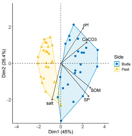 Topsoil characteristics of habitats showed a significant difference between the two sides of Budapest (Tables S4 and S5, Supplementary Materials). The PCA biplot resulted in two distinct, non-overlapping groups of study sites (Figure 5). The first two principal components explained 71.4% of the total variance of the dataset. Sites located in Buda were characterized by soils with higher pH, saturation percentage (SP), and CaCO3 and SOM content. Soil pH and SP were significantly affected by urbanization. Soils of more urbanized habitats had higher pH (t = 2.0, p = 0.050) and lower soil plasticity (t = −2.7, p = 0.007) compared to less disturbed sites.