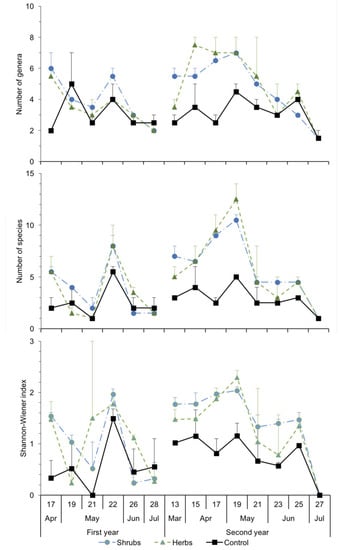 Numbers of genera (upper chart) per margin type on each sampling date and species (central) and the Shannon-Wiener index (lower) in pan traps in shrubby, herbaceous and control margins (means±SE). The numbers in the abscise (x) axe indicate the week of the year.