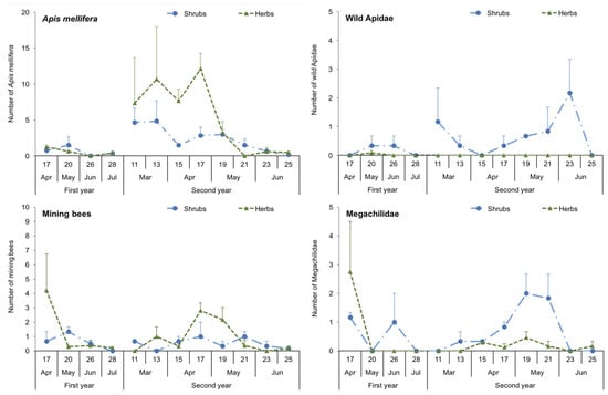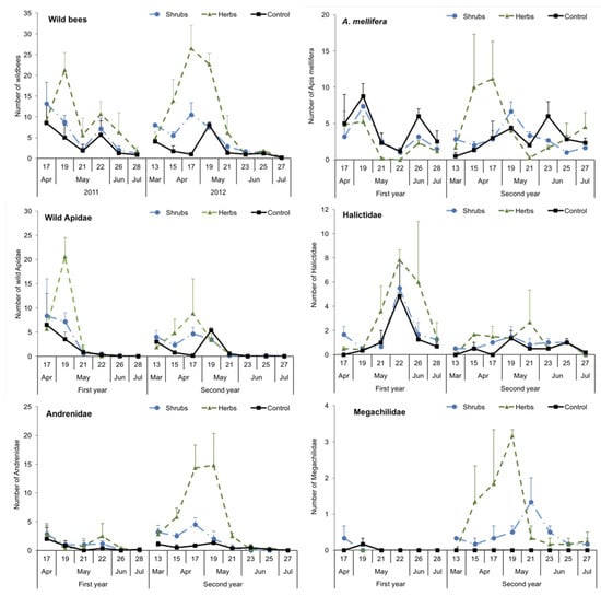 Trends in the numbers of wild bees (means ± SE), A. mellifera, wild Apidae, Halictidae, Andrenidae and Megachilidae captured in pan traps in shrubby, herbaceous and control margins. The numbers in the abscise (x) axe indicate the week of the year.