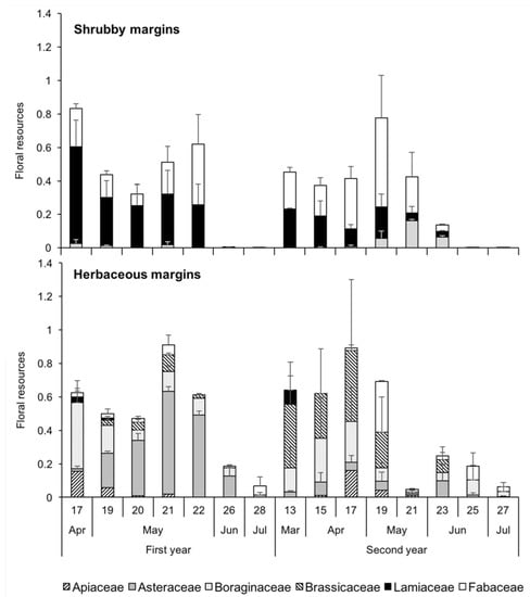 Plant species of the Lamiaceae and Fabaceae (Table 1) represented most of the floral resources in shrubby margins (Figure 4). Plants of these families blossomed mainly in the Spring of the first and second years. Asteraceae were infrequent in shrubby margins and blossomed in late Spring, especially in the second year. In herbaceous margins, Boraginaceae and Asteraceae offered most of the floral resources in the first year: Borago officinalis L. and Echium vulgare L. blossomed abundantly in mid-Spring and were replaced by Calendula officinalis L. from mid-May onwards (Figure 4). In the second year, the floral resources were similar to those of the first, with the exception that Asteraceae were uncommon and almost completely replaced by Brassicaceae.