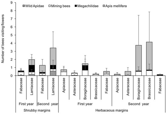 Annual averages of the different bee groups (A. mellifera, wild Apidae, mining bees and Megachilidae) observed in 2 × 2 m squares over a four-minute period in shrubby, herbaceous and control margins (means ± SE).