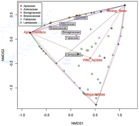 Plot of the scores of the first two components for the different plant families (symbols) and bee groups (red labels) in the of non-metric multidimensional scaling (NMDS). The black labels indicate the centroids for the different plant families.