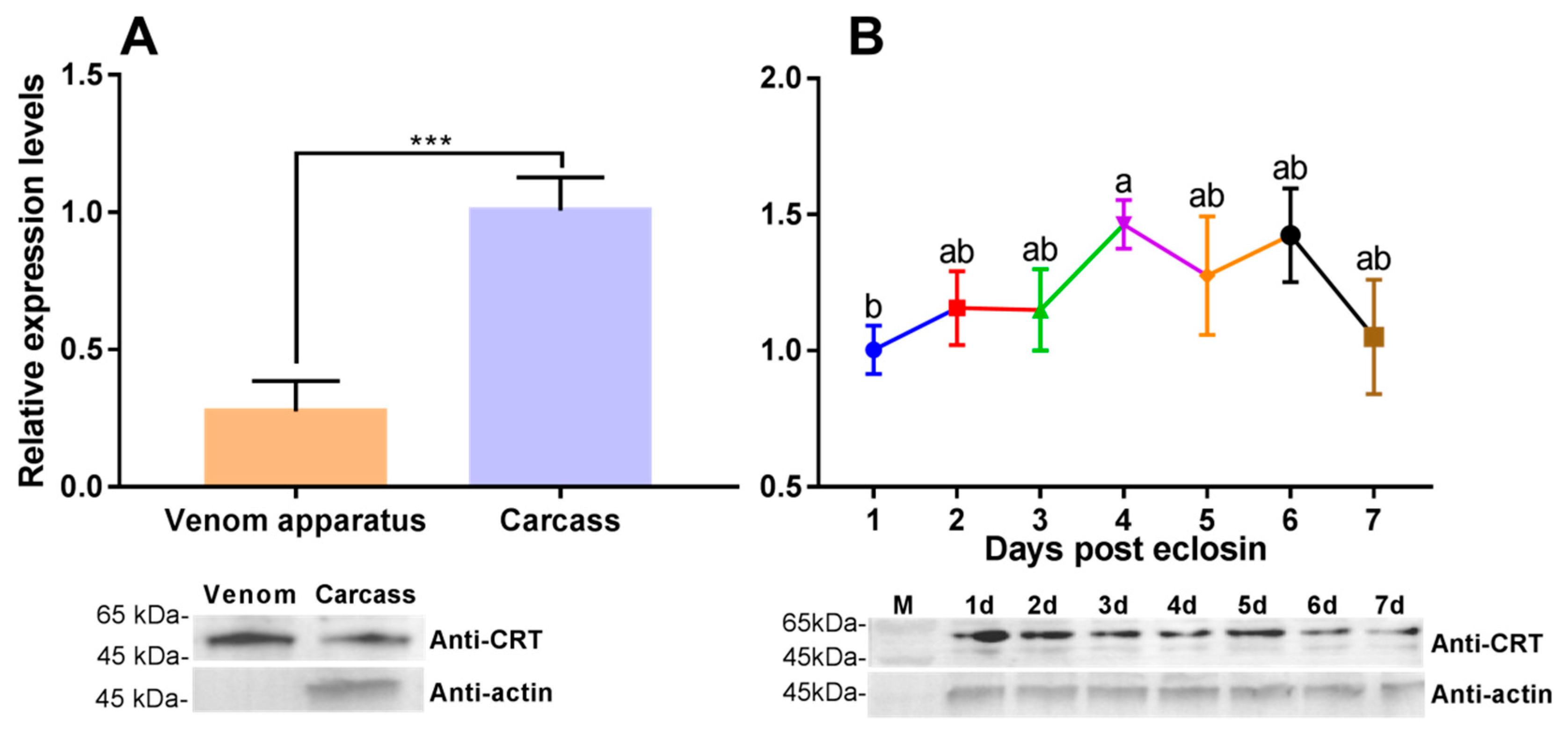- Siebert, A.L.; Wheeler, D.; Werren, J.H. A new approach for investigating venom function applied to venom calreticulin in a parasitoid wasp. Toxicon 2015, 107, 304–316. [Google Scholar] [CrossRef]