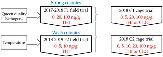 Experimental design of field and laboratory cage trials. Field trials examined the effects of chronic overwinter exposure to thiamethoxam (THI) on survival of strong colonies (F1) or weak colonies (F2), as well as sublethal effects on queen quality and pathogen load (F1) and colony temperature regulation (F2). Cage trials examined the effects of chronic exposure to THI or its metabolite clothianidin (CLO) on laboratory survival of winter adult workers.