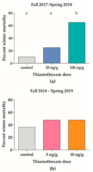 Chronic high-dose (100 ng/g) thiamethoxam significantly increases overwinter mortality of Apis mellifera colonies in the field. Honey bee colonies were chronically exposed to thiamethoxam over winter in field trial 1 (2017–2018) (a) or field trial 2 (2018–2019) (b), and survival of the colonies was evaluated the following spring. Bars indicate percent overwinter colony loss for twenty to twenty-two colonies per group. Different letters indicate significant differences by a z-test, p < 0.05.