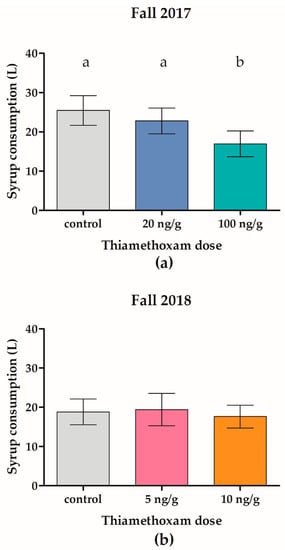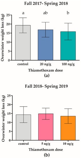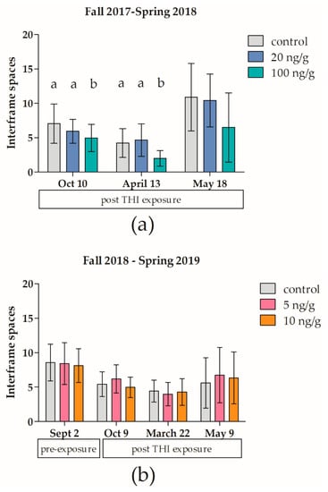 Similar to our study, Overmeyer et al. (2018) [] observed that high dose, 100 ng/g THI-exposed colonies consumed less syrup compared to lower-dose THI treatments and controls. Decreased colony strength and population size may explain the decrease in syrup consumption and overwinter weight loss (reflecting consumption of overwinter food stores) of the 100 ng/g THI-treated colonies in our study (Figure 4a and Figure 5a).