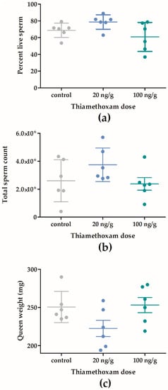 Queen quality was not significantly affected by chronic overwinter THI exposure in F1 (Figure 6). Six control queens, six queens exposed to 20 ng/g of THI, and six queens exposed to 100 ng/g of THI did not differ significantly in sperm viability (mean live = 69.4%, SD = 13.69, F2,15 = 3.23, p = 0.0681, Figure 6a), total sperm count (2.91 × 106, SD = 1.35 × 106, F2,15 = 1.98, p = 0.1729, Figure 6b), or queen weight (242 mg, SD = 26.62, F2,15 = 3.15, p = 0.0722, Figure 6c).