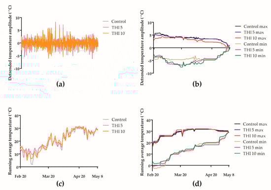 Environmental doses of (5 and 10 ng/g) thiamethoxam do not significantly affect within hive temperature during winter and early spring compared to controls. Honey bee colonies were exposed to thiamethoxam (THI) during winter 2018–2019 in field trial 2. Lines indicate mean detrended temperature amplitude (a), maximum and minimum detrended temperature amplitude (b), mean running average temperature (c), and maximum and minimum running average temperature (d), in degrees Celsius, for 10–14 colonies for 78 days, from February to May 2019.