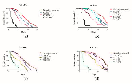 To evaluate the effects of neonicotinoids on laboratory survival of winter adult workers, winter workers received ad libitum 1:1 (w:v) sucrose syrup containing THI or CLO, over 30 days, and survival was monitored daily (Table 2). Negative controls received untreated syrup, and positive controls received syrup containing dimethoate [].