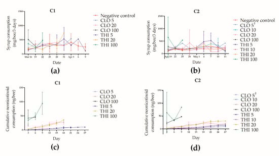 Laboratory syrup consumption and cumulative neonicotinoid consumption of winter adult Apis mellifera workers. Winter workers were exposed to thiamethoxam (THI) or clothianidin (CLO) (doses in ng/g) for 30 days, through syrup, and mortality was monitored daily. Two laboratory cage trials were conducted: C1 in March–April, 2018 (a,c) and C2 in April–May, 2018 (b,d). Only C2 included 10 ng/g dose groups. Lines indicate mean syrup consumption in mg per bee per three days (a,b) and mean cumulative neonicotinoid consumption in ng per bee (c,d). † Consumption data for day six were missing for the CLO 5 group in C2.