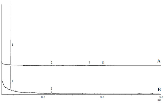 Typical gas chromatogram of (A) rectal gland extract and (B) headspace collections of B. musae males. Numbered peaks indicate detected compounds: ethyl butanoate (1), N-(3-methylbutyl)acetamide (2), ethyl laurate (7) and ethyl myristate (11).