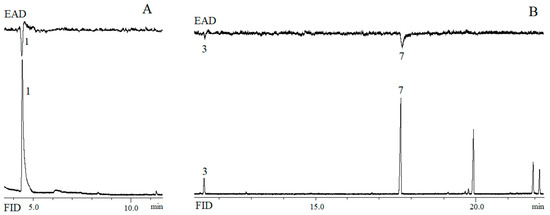 Simultaneous response of flame ionisation detector (FID) and electroantennographic detection (EAD) using B. musae (A) female antenna with rectal gland extract from conspecific males and (B) male antenna to rectal gland extract from conspecific females. Numbered peaks indicate EAD-active compounds: ethyl butanoate (1), (E,E)-2,8-dimethyl-1,7-dioxaspiro[5.5]undecane (3) and ethyl laurate (7).