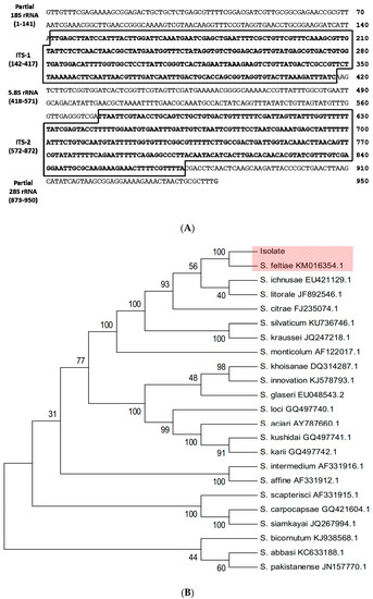 To identify the nematode isolate, ITS regions were amplified and sequenced (Figure 2A). A total of 950 bp was sequenced for the isolate and compared with a known sequence of Caenorhabditis elegans (Nematoda: Rhabditida) [38] to confirm that these sequenced regions included ITS. The determined sequence contained 5.8S rRNA, ITS-1, and ITS-2 regions as well as partial sequences of 18S and 28S rRNAs. Its sequence was deposited at GenBank with an accession number of MN093395.1. The sequence showed high similarities (>99%) with known ITS sequences of several S. feltiae strains (Table 1). To evaluate the relationship between the isolate and other known Steinernema spp., a phylogenetic tree was constructed using ITS sequences (Figure 2B). The isolate was significantly (bootstrap value = 100) clustered with a local isolate of S. feltiae from Czech Republic [39] among 25 different species of Steinernema.