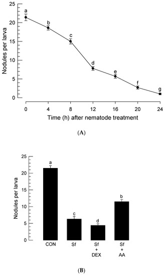 The inhibition of PLA2 by the infection of S. feltiae K1 suggested that there might be an immunosuppression due to the lack of eicosanoid immune mediators [16]. To test this hypothesis, a cellular immune response measured by nodule formation was monitored for 24 h after infection with the nematode (Figure 5A). The infection with the nematode significantly (p < 0.05) suppressed nodule formation. The suppression began at 4 h after infection with the nematode. At 24 h post-infection, larvae infected with S. feltiae K1 almost lost their nodule formation ability. To test a hypothesis that the immunosuppression might be induced by downregulated PLA2 activity inhibited by the nematode, DEX or AA was added to nematode-infected larvae (Figure 5B). DEX treatment further significantly (p < 0.05) suppressed nodule formation while AA addition significantly (p < 0.05) rescued such immunosuppression.