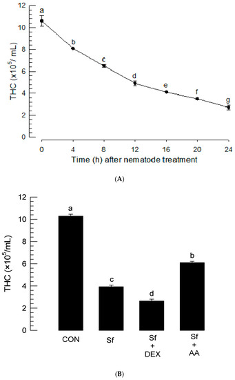 2.8. Total Hemocyte Count (THC) Analysis after Nematode Treatment