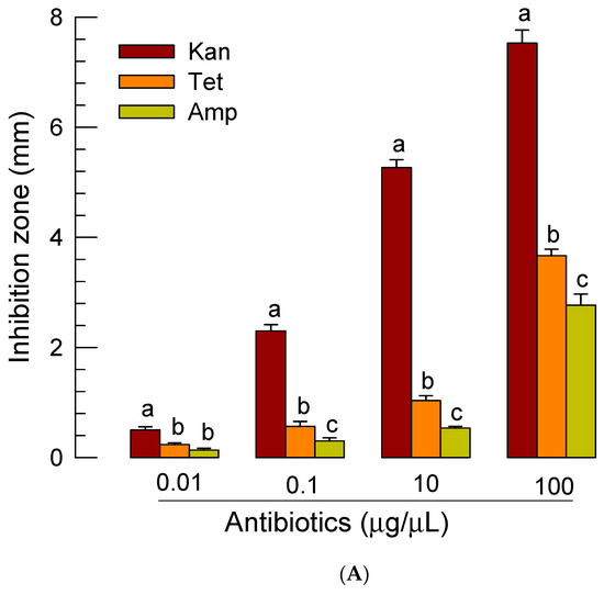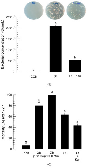 S. feltiae possesses species-specific symbiotic bacterium X. bovienii in the intestine [41]. This suggests that the insecticidal activity of S. feltiae K1 might be induced by both symbiotic bacteria and their host, the nematode. To discriminate bacterial contribution from the nematode, treatment with antibiotics was performed after nematode infection. First, we selected an effective antibiotic against X. bovienii based on an inhibition zone assay (Figure 7A). Among three antibiotics used, kanamycin was the most effective one in suppressing the bacterial growth at all test concentrations. We then treated P. xylostella larvae with different concentrations of kanamycin (Figure S1). At a high concentration (100 μg/larva), kanamycin was harmful for the survival of P. xylostella larvae. When a relatively low concentration (0.1 μg/larva) of kanamycin was injected to larvae already treated with S. feltiae K1, bacterial growth was suppressed by more than 75% (Figure 7B). Under these antibacterial treatment conditions, contributions of bacteria and nematode to insecticidal activity against P. xylostella were separately assessed (Figure 7C). Kanamycin treatment along with nematode infection significantly (p < 0.05) decreased the insecticidal activity induced by infection of S. feltiae K1 alone. However, it did not completely rescue nematode-infected larvae.