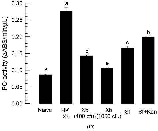 PO activity of P. xylostella, which would be required for both cellular and humoral immune responses, was significantly (p < 0.05) suppressed by the injection with live X. bovienii bacteria while such activity was significantly enhanced by the injection with heat-killed X. bovienii bacteria (Figure 7D). The nematode infection also significantly suppressed PO activity. However, an addition of kanamycin partially rescued the PO activity suppressed by the nematode infection.