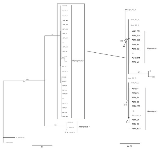 Maximum likelihood trees based on COI sequences of A. spiniferus. Bootstrap values >70% are shown above the branches. Complete tree (left) and zoom on phylogenetical relationships in Haplogroup 2 (right). Sequences from [9] and [16] are in grey; sequences obtained in this work are in black.