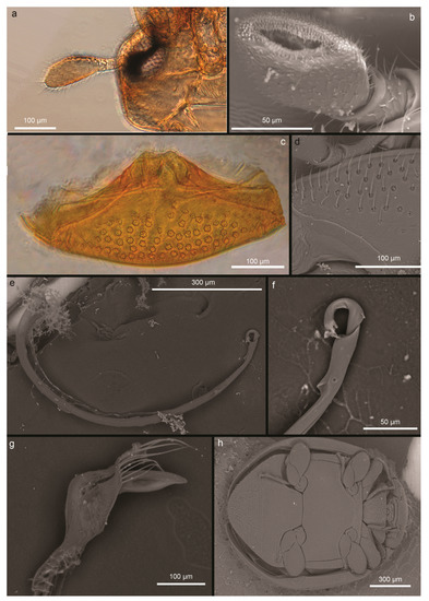 As well as other members of the tribe Serangiini, the genus has a small body that is ovoid and strongly convex at the dorsum [70]. In particular, D. catalinae presents a one-segmented antennal club, 2.2 times longer than wide (Figure 3a); maxillary palp with apical segment conspicuous, two times longer than wide, ovoid, with the inner face truncated in oblique where sensilla are placed (Figure 3b); prosternum shows dense setose punctures (n = 10) consisting of seta, each encircled by not less than five loculi (Figure 3c,d). Female length is 1.38 ± 0.17 mm (n = 10); males are 1.22 ± 0.1 mm (n = 10) in length. Male genitalia are asymmetrical, phallobase with unpaired apodeme, and sipho arcuate with spathiform siphonal proximal capsule (Figure 3e,f); the parameres are very short but recognizable and with long setae, which reach the apex of the median lobe (Figure 3g); legs with expanded femurs, middle and hind tibiae are arcuate with bristles on outer margin, and tarsus three-segmented (Figure 3h).