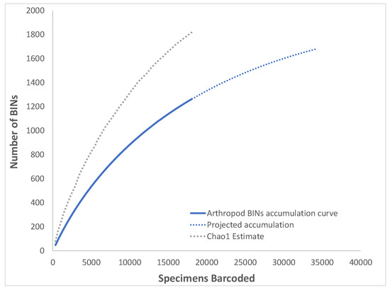 The completeness of species coverage was estimated with accumulation curves based on the BIN data. With only a subset of each sample processed, multiple accumulation curves were created for different orders to account for the abundance bias and extrapolated to 100 sites with EstimateS 9.1.0 [35]. Samples were grouped into sites (n = 53) with distinct GPS coordinates to account for collective effort at one particular locality split among several samples (e.g., multiple jars/vials per collecting event) and for collecting at the same site on different dates. Chao1 estimates were not calculated for insect orders that were represented by less than 10 species (Ephemeroptera, Plecoptera, Trichoptera, Thysanoptera) and for orders of mites and collembolans where some order-level assignments were inconclusive or based solely on molecular data.
