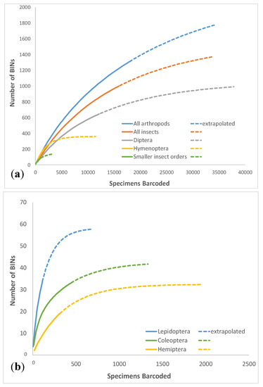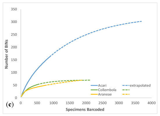 Chao1 estimate for the entire arthropod dataset calculated using EstimateS was 1820 ± 72.9 (lower-upper 95% confidence interval bound estimate 1695–1983), suggesting that DNA barcodes were recovered from approximately 69% of species potentially occurring in the study area, although the Chao1 estimate trend line did not reach an asymptote (Figure 1). This ratio was consistent with that calculated for most lower-level taxa (Table 2) which varied between 67–80%. The two exceptions were Collembola and Hemiptera, where recovered BINs represented 29% and 43% of the estimated diversity, respectively. These taxa also had the highest discrepancies between lower and upper 95% confidence interval bound for Chao1 estimates: 10.7 and 5.9-fold, compared to 1.2–2.5-fold for the remaining arthropods (Table 2). The extrapolated accumulation curves (Figure 2a,b) were generally in agreement with the Chao1 estimators calculated for the various taxa, except for Collembola, for which the extrapolated diversity was ca. 60 BINs (Figure 2c) but the Chao1 estimator was 180.8 (lower-upper 95% confidence interval bound estimate 74.8–802.1).