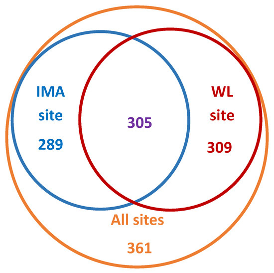 Venn diagram showing the number of Barcode Index Numbers (BINs) collected at each of the two continuously monitored sites, compared against the overall diversity observed. IMA—CHARS Intensively Monitored Area north of Grenier Lake; WL—Water Lake north of Cambridge Bay.