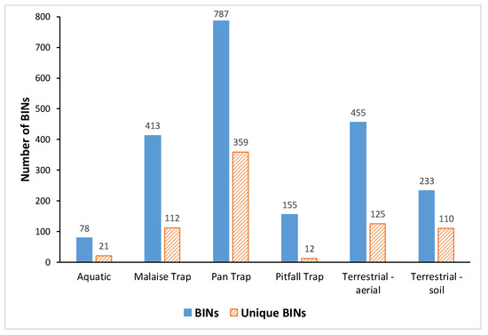Observed species richness (BINs) and number of unique BINs sampled by the main categories of collecting protocols.