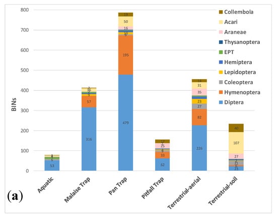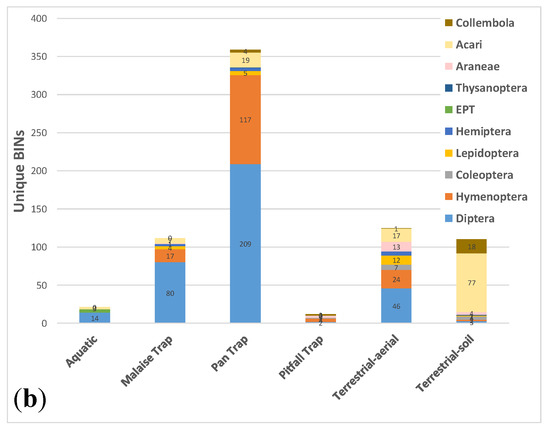 Species richness of major taxonomic groupings of arthropods sampled using different collecting methods: (a) all BINs collected by each method; (b) unique BINs collected by each method. (EPT—Ephemeroptera, Plecoptera, and Trichoptera combined).