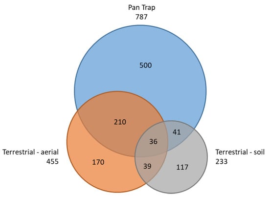 Pan traps captured both the highest number of BINs overall (787, or 62% of the total BIN count) and the highest number of unique BINs (359) not caught with any other sampling method (Figure 4). The next highest BIN count was recorded by terrestrial-aerial active sampling (sweep-net and freehand; 455 BINs, of which 125 unique), followed by Malaise traps (413 BINs, of which 112 unique). Table 3 provides a summary of the BIN counts and overlap between the sampling methods. The taxonomic composition at the order level was similar between pan traps and malaise traps, with Diptera and Hymenoptera overwhelmingly dominating the catch (Figure 5). Active terrestrial sampling methods, especially soil and leaf litter sifting, captured a distinctly different set of higher taxa (Figure 5). Figure 6 shows the BIN overlap between pan traps, sweep-netting (terrestrial–aerial), and soil and litter sifting (terrestrial–soil), which collectively accounted for 88% of the BINs recorded.