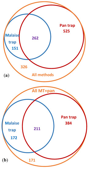 Comparative species diversity captured by different trap types and collecting methods and taxonomic overlap between them were estimated based on the presence or absence of BINs in the samples collected with the corresponding technique. The vocabulary used in field notes was standardized to aggregate records, based on the type of activity (i.e., passive or active trapping) and based on the targeted habitats (i.e., aquatic or terrestrial). The traps left unattended for a certain period of time, i.e., Malaise trap, pitfall trap and pan trap, were collectively considered passive terrestrial collecting methods. All aquatic collecting methods were considered active, because no traps targeting aquatic habitats were used. Active terrestrial methods included soil transects and sweep netting at the continuously monitored sites, as well as opportunistic sifting, sweep netting, and free hand collecting outside these sites.