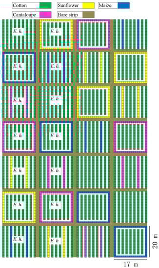 Spatial layout of the field experiment. E. h. indicate that Eretmocerus hayati was released in this plot. Plots (17 × 20 m) consisted of nine rows of planting beds, each 20 m long and 1 m wide, separated by 1 m from each other. Each bed was planted with two rows of cotton plants, and each row was planted with 60 plants 33 cm apart. Plots were separated from each other by a 2 m wide bare strip.