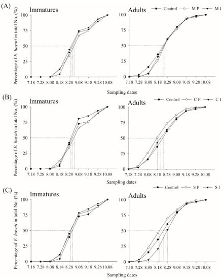Censuses were conducted every 10 days using the same leaves as for the whitefly population census on cotton. Adult parasitoids were counted on the spot. After this, the selected leaves were taken back to the laboratory for examination under a dissecting microscope (2× magnification). Whitefly nymphs with displaced myelomas (symbiotic housing organs) were considered parasitized. The nymphs were subsequently maintained with the host leaf petiole soaking in nutrient solution for an additional 5–7 days in the laboratory until parasitism could be ascertained by the yellow coloration of the E. hayati pupal stage []. The first record of parasitoids on cotton leaves was about 3 weeks after the first release, on 8 August (in CP and SI), but densities were very low (0.036 and 0.181 individuals 100 cm−2, respectively). Parasitoids started to be common in all plots from 18 August onwards.