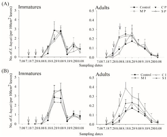 The average adult density during the entire season was 1.44 individuals 100 cm−2 leaf surface (SD = 1.12, n = 308). Adult densities were 1.15 ind. 100 cm−2 (SD = 1.05, n = 112) during the early period, peaked at 2.33 ind. 100 cm−2 (SD = 1.11, n = 84) during the main, and were reduced to 1.07 ind. 100 cm−2 (SD = 0.78, n = 112) during the late season. The average immature density during the entire season was 6.8 individuals 100 cm−2 (SD = 5.96, n = 308). Immature densities were 4.21 ind. 100 cm−2 (SD = 4.2, n = 112) during the early season, increasing to 13.33 ind. 100 cm−2 (SD = 6.19, n = 84) during the main season before decreasing to 4.50 ind. 100 cm−2 (SD = 2.73, n = 112) during the late season. Parasitoid density during the entire season was 0.12 ind. 100 cm−2 (SD = 0.12, n = 224), showing a similar seasonal trend: 0.02 ind. 100 cm−2 (SD = 0.04, n = 28) during the early, 0.19 ind. 100 cm−2 (SD = 0.13, n = 84) during the main, and 0.08 ind. 100 cm−2 (SD = 0.09, n = 112) during the late season. Parasitoid seasonality did not differ much between the treatments (Figure 2).
