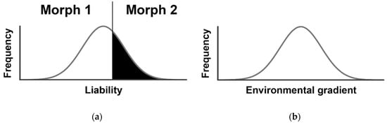Threshold genetic models for dimorphic traits, such as migratory vs. non-migratory morphs. (a) The classical threshold genetic model. Liability represents the normally-distributed underlying trait (gray curve), with the vertical line indicating a fixed threshold that determines the transition from one morph to another; (b) The environmental threshold model. Here, the genetically-determined thresholds for transition between morphs are normally distributed (gray curve), and correspond to the level of an environmental variable. After Roff [28].