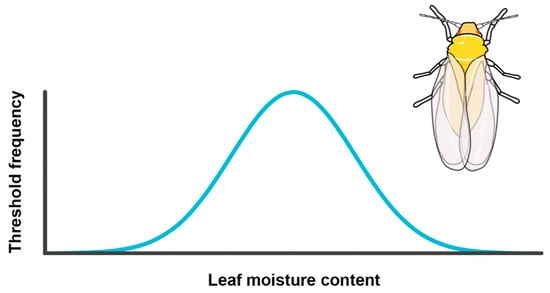 Hypothesized environmental threshold model for migration in the sweet potato whitefly, Bemisia tabaci. Here, the genetically-determined threshold for switching to a migratory phase (blue curve) corresponds to leaf moisture content. Whitefly illustration by Cynthia Harley.