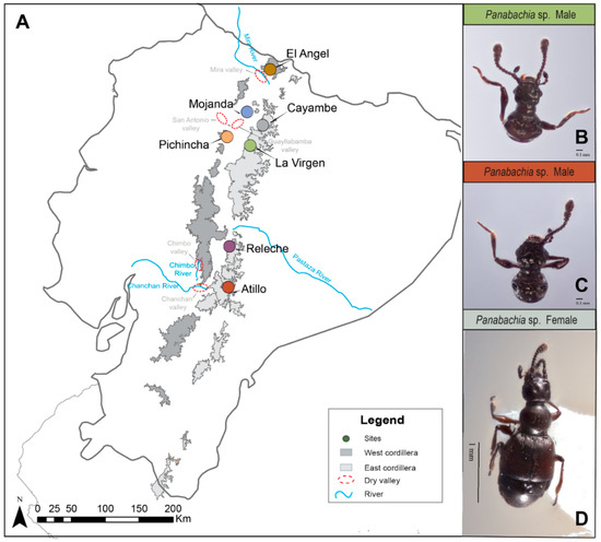 (A) Map of the collecting sites for Panabachia in the Ecuadorian Andes. Sites are represented by colored circles, the páramo ecosystem (above 3000 m) is highlighted in grey, and divided into East (light grey) and West (dark grey) cordillera. Potential geographical barriers (rivers and dry valleys) are highlighted in this map. (B) Head and pronotum from male individual from the La Virgen site. (C) Head and pronotum from male individual from the Atillo site. (D) Female individual from the Cayambe site.