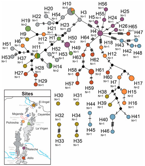 - Muñoz-Mendoza, C.; D’Elia, G.; Panzera, A.; Villalobos-Leiva, A.; Sites, J.W., Jr.; Victoriano, P.F. Geography and past climate changes have shaped the evolution of a widespread lizard from the Chilean hotspot. Mol. Phylogenet. Evol. 2017, 116, 157–171. [Google Scholar] [CrossRef] [PubMed]